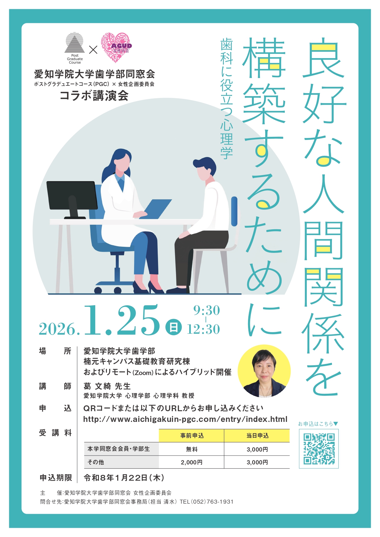 セミナー情報 コラボ講演会のお知らせ gihoukai-2019 2025年10月21日 愛知学院大学歯学部同窓会 コラボ講演会のお知らせ 愛知学院大学歯学部同窓会 ポストグラデュエートコース(PGC)×女性企画委員会 コラボ講演会が開催されます 良好な人間関係を構築するために 歯科に役立つ心理学 みなさまのご参加申込みをお待ちしております。